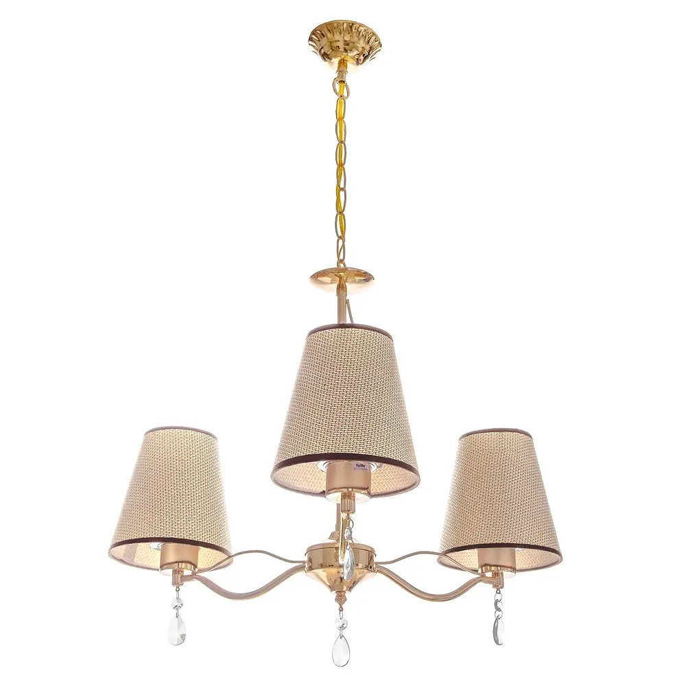 Трехрожечная люстра BKL-648S/3 E27 FG с абажурами хорошо осветит небольшое помещение, выполненное как в классическом, так и в современном стиле. Наличие металлической цепи, с помощью которой можно изменять высоту светильника, позволяет монтировать его в помещениях с низкими потолками. Конструкция представлена небольшим металлическим каркасом золотистого цвета, к которому прикреплены три тканевых плафона коричневого цвета. Тканевые абажуры обладают свойством частично поглощать свет, создавая спокойную, интимную атмосферу. Дополнительно каркас украшен подвесками со стеклянными гранеными камешками. Для работы нужно использовать три лампы с цоколем Е27 (разожженная, энергосберегающая, светодиодная).
