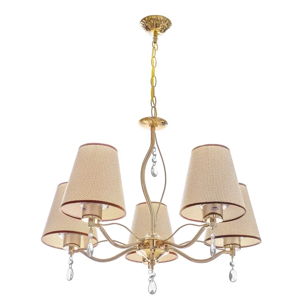 Пятирожковая люстра BKL-648S/5 E27 FG с абажурами хорошо осветит помещение стандартной высоты площадью 18-20 квадратных метров, выполненное как в классическом, так и в современном стиле. Наличие металлической цепи, с помощью которой можно изменять высоту светильника, позволяет монтировать его в помещениях с низкими потолками. Конструкция представлена небольшим металлическим каркасом золотистого цвета, к которому прикреплены пять тканевых плафонов коричневого цвета. Тканевые абажуры обладают свойством частично поглощать свет, создавая спокойную, интимную атмосферу. Дополнительно каркас украшен подвесками со стеклянными гранеными камешками. Для работы необходимо использовать пять лампочек с цоколем Е27 (разогревающая, энергосберегающая, светодиодная). На всю продукцию действует гарантия.