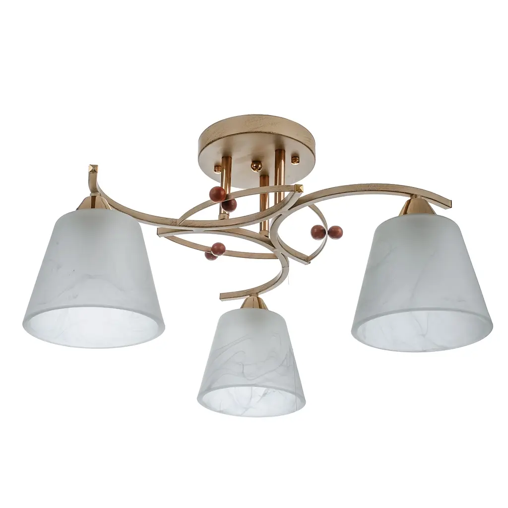 Люстра торговой марки Brille впишется в любой интерьер и придаст ему уютную теплоту. Милый и легкий дизайн данного осветительного прибора добавит особую изюминку в вашу гостиную, прихожую, спальню или кухню. Корпус изготовлен из металла золотистого цвета, с искусственно состаренной поверхностью. Плафоны выполнены из белого стекла. Люстра декорирована деревянными горошинками. Крепится изделие с помощью монтажной планки. Для работы осветительного прибора требуется 3 лампы с цоколем E27. Подойдут лампы любого типа (разожженные, светодиодные, энергосберегающие).