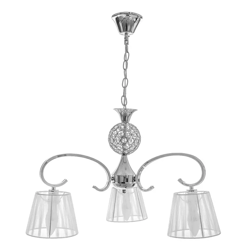 Люстра BKL-483S/3 E14 CH подойдет для тех, кто видит в светильнике еще и дополнительное украшение интерьера. К металлическому хромированному каркасу прикреплены три абажура из белой полупрозрачной ткани. Такая люстра будет хорошо смотреться в помещении с высоким потолком, например в просторной гостиной или спальне. Люстра крепится к потолку с помощью цепи, длина которой регулируется. Для работы люстры требуется 3 лампочки с цоколем E14 мощностью 40 Вт. Подойдут светодиодные, энергосберегающие или лампочки накаливания. Рекомендуем использовать светодиодные лампы, поскольку они не нагреваются, экономят электроэнергию и не содержат вредных веществ. Высота осветительных приборов легко регулируется, ее можно изменить, подняв или опустив цепь, веревку или трос. Таким образом люстра будет висеть на большей или меньшей высоте в зависимости от ваших предпочтений. Высота осветительных приборов легко регулируется, ее можно изменить, подняв или опустив цепь, веревку или трос. Таким образом люстра будет висеть на большей или меньшей высоте в зависимости от ваших предпочтений.
