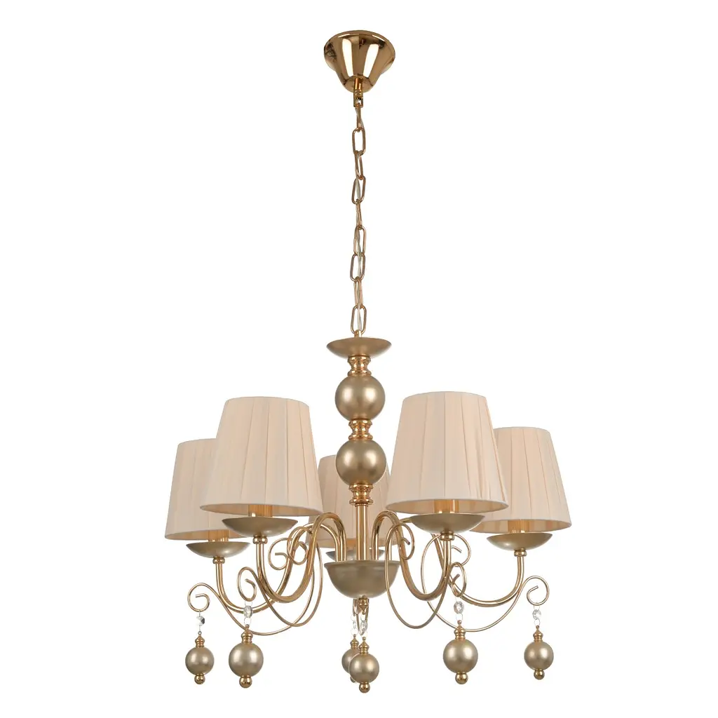 Подвесная люстра BKL-718S/5 E14 FGD+CN является ярким представителем классических моделей. Она предназначена для больших помещений, в которых требуется яркое освещение, дающее хорошую цветопередачу. Люстра состоит из потолочного крюка и цепи, на которой крепится массивная основа, от которой расходятся в разные стороны держатели плафонов. Все они изготовлены из металла, имеют позолоченное покрытие. Плафоны изготовлены из ткани, они преобразуют лучи света в объемное освещение. Для освещения используют как лампочки накаливания, так и светодиодные аналоги с цоколем Е14. Высота модели регулируется в зависимости от предпочтений пользователя (от 540 мм до 1010 мм). На всю продукцию действует гарантия.