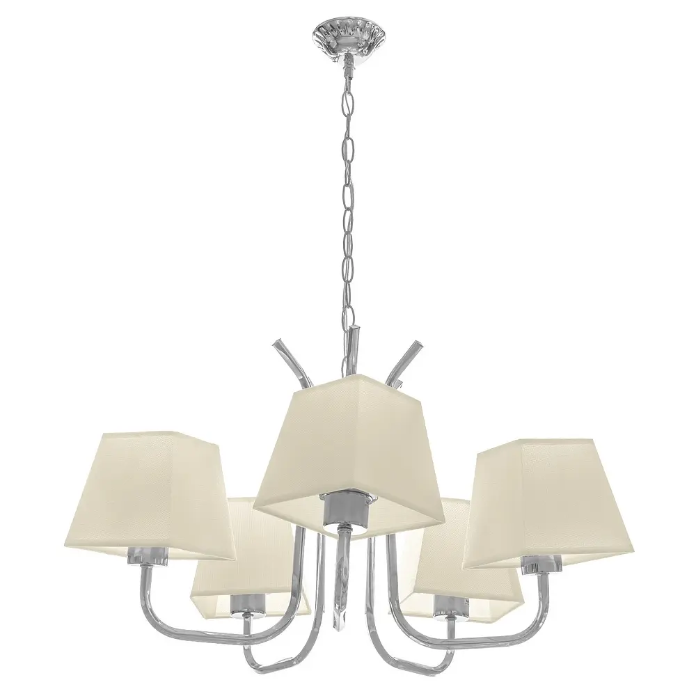 Люстра подвесная с абажурами BKL-653S/5 E27 CH имеет очень стильный вид. Она обеспечит мягкое освещение гостиной или спальни. Подойдет как для классических, так и современных интерьеров. Конструкция представлена небольшим металлическим каркасом цвета хром, к которому прикреплены пять тканевых абажуров бежевого цвета. Тканевые абажуры имеют свойство частично поглощать свет, создавая спокойную атмосферу. Наличие металлической цепи, с помощью которой можно изменять высоту светильника, позволяет монтировать его в помещениях с низкими потолками. Для работы необходимо использовать пять лампочек с цоколем Е27 (раскалительная, энергосберегающая, светодиодная).