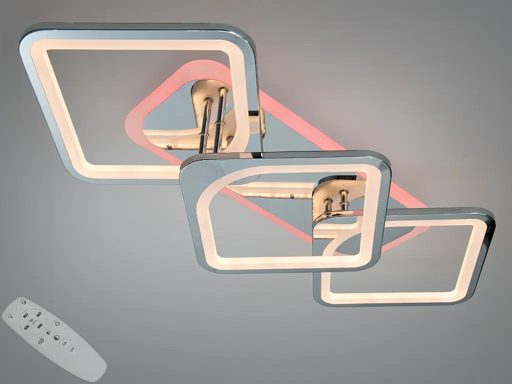 Потолочная LED-люстра Diasha серии 8060 в золотом цвете сочетает четкую геометрию и удобное управление. Три квадратных LED-элемента дают равномерный свет, а пульт помогает гибко настраивать яркость - от мягкого вечернего до рабочего уровня. Мощность 75 Вт обычно подходит для комнат площадью до 13 м². Декоративная фиолетовая подсветка добавляет акцент для спокойных вечерних сценариев.