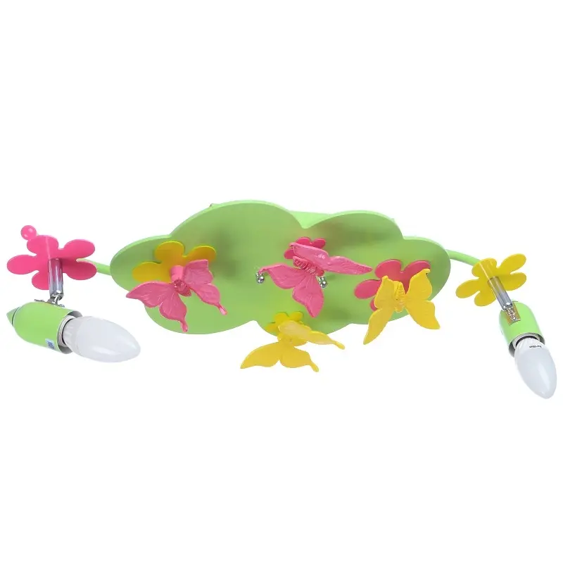 Детская люстра KL-401C/2 E14 является не только основным источником освещения детской комнаты, но и самостоятельным элементом декора. Люстра изготовлена из металла, пластика и дерева, благодаря чему достаточно прочна и долговечна. Деревянный каркас окрашен в зеленый цвет, имитирует лужайку. Декорирована люстра пластиковыми цветочками розового цвета и бабочками желтого цвета. Лампочки могут изменять угол наклона, что позволяет самостоятельно регулировать направление света. Для работы люстры необходимо две лампочки с цоколем Е14 мощностью 40 Вт. Люстра имеет три режима свечения, на которые можно переключаться выключателем. При первом включении загораются лампочки, при втором - работает только светодиодная подсветка, в третий раз - загораются и лампы и подсветка. Люстра рассеивает мягкий, приятный для детского восприятия свет. Такая люстра не оставит равнодушной ни одну девочку, подарит ей массу приятных эмоций.