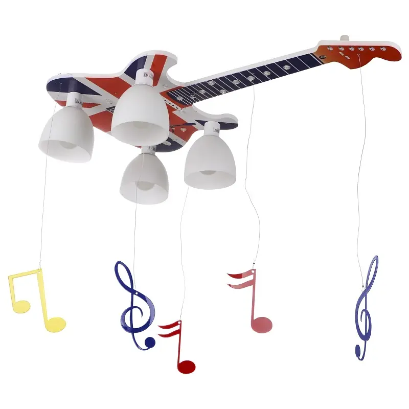 Люстра ТМ Brille KL-417C/4 E14 BL изготовлена из дерева, матового стекла и пластика. Ее основа повторяет черты электронной гитары, которая окрашена в цвет британского флага. На каркасе люстры расположены четыре небольших стеклянных плафона, которые излучают свет исключительно вниз. К каркасу люстры также подвешены пластиковые ноты и скрипичные ключи. Источником света выступают четыре лампочки с цоколем Е14 и мощностью 40 Вт. Кроме этого, люстра оборудована дополнительным освещением, расположенным по всей поверхности основания.