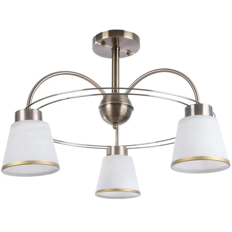 Каждый из нас хочет обустроить свой дом и чувствовать себя в нем максимально комфортно и уютно. Выбирая предметы мебели, цвет стен, фактуру занавесок, можно упустить такой важный момент, как выбор осветительного прибора. Люстра LK-524S/3 E27 будет хорошо смотреться в интерьере в светлых тонах. При изготовлении люстры мастера традиционно сочетали два материала: стекло и металл. Такой выбор материалов обусловлен тем, что стекло хорошо пропускает свет, а свойства металла позволяют придать изделию любую нужную форму. Люстра из этих материалов прослужит вам много лет, не потеряв своей актуальности. Что касается дизайна люстры, то она имеет металлический каркас цвета старого золота и три стеклянных матовых плафона белого цвета с золотистой каймой по краям. Для работы люстры необходимо три лампочки с цоколем Е27.