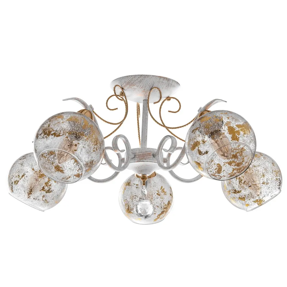 Потолочная люстра BKL-596S/5 E14 WH/G изготовлена из металла и стекла. Традиционно конструкция состоит из металлического каркаса белого цвета с золотистыми вкраплениями, к которому прикреплены пять плафонов. Плафоны стеклянные, с золотистыми вкраплениями, выполнены в форме шара. Освещение будет мягким, несколько приглушенным, приятным для восприятия и создания комфортной обстановки. Для работы необходимо использовать пять лампочек с цоколем Е14 (раскаливая, энергосберегающая, светодиодная).