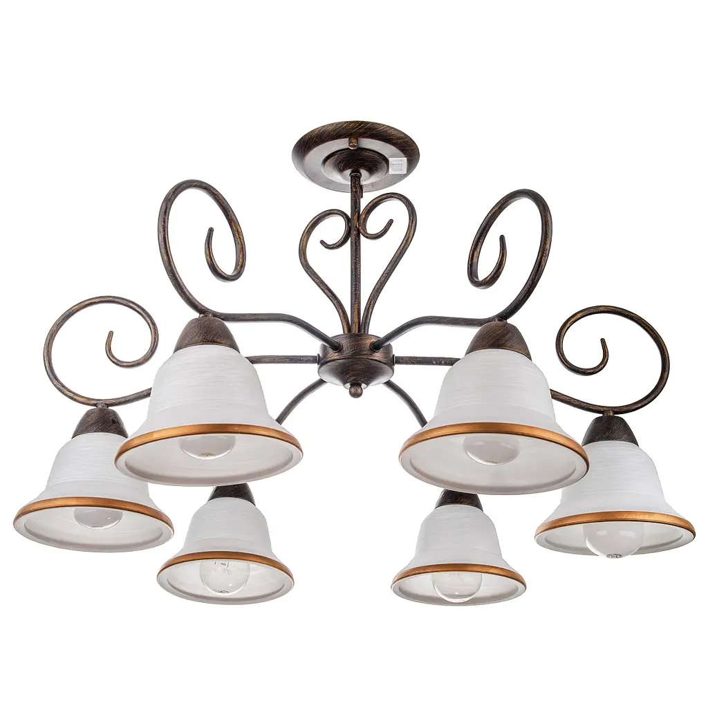 Люстра LK-153S/6 станет отличным дополнением к интерьеру помещения в стиле кантри. Данная люстра сочетает в себе все элементы этого стиля: минимальная обработка материалов, из которых изготовлена люстра, отсутствие сложных линий, роскоши, гламура, присутствие кованых декоративных элементов. Люстра выглядит просто и легко. Она изготовлена из металла и стекла, представляет собой нехитрую конструкцию с металлическим каркасом цвета старой бронзы и шестью стеклянными матовыми плафонами, декорированными золотистой каймой. Люстра рассчитана на шесть лампочек с цоколем Е27 мощностью 60 Вт каждая. Поскольку кантри в переводе означает "деревенский" или "провинциальный", то такую люстру можно повесить в загородном доме или в коттедже. Люстра излучает мягкий, приятный для восприятия свет.