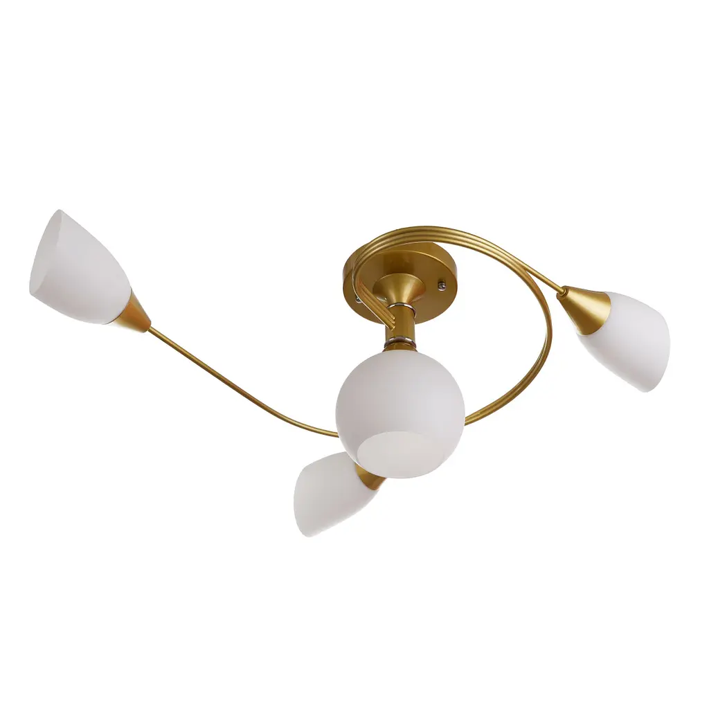 Люстра с золотистым покрытием на 4 лампочки BR-01 609C/4 E27 G - это современный светильник, который имеет оригинальную конструкцию и подходит для гостиных, спален, прихожих и кухонь. От металлической круглой основы отходят 4 держателя стеклянных белых плафонов, один из них крепится в центре, его свет направлен вниз, а 3 других - на металлическом корпусе, имеющем форму ветки. Свет этих трех источников направлен в стороны. Корпус модели изготовлен из металла, покрытие золотистого цвета идеально сочетается с плафонами. Плафоны открытого типа формируют приятный свет. Люстру устанавливают на потолок с помощью монтажной планки. Для ее работы нужно использовать 4 лампочки с цоколем Е27 мощностью 60 Вт. Это могут быть энергосберегающие, светодиодные или лампы накаливания. Люстра имеет компактные габариты: ее высота - 25 см, поэтому подойдет для помещений с разной высотой потолков.