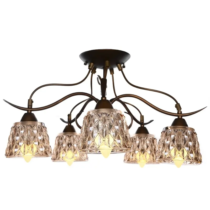 Для ценителей красоты в простоте, мы предлагаем приобрести новинку от ТМ Brille - люстру для потолка LK-269S/5 E14. Если вам нравятся новинки, и вы предпочитаете стильным новшествам, тогда эта люстра то, что вы ищете. Материалами для изготовления люстры послужили металл и стекло, она проста в эксплуатации, не требует к себе особого ухода. Конструкция люстры состоит из металлического фигурного каркаса цвета старого золота и пяти стеклянных граненых плафонов с геометрическим узором в форме чаши цвета шампань. Люстра излучает мягкий, слегка приглушенный свет, направленный вниз, поэтому от люстры будет хорошая светоотдача. Источником света в люстре выступают пять лампочек с цоколем Е14 мощностью 40 Вт. Повесить такую люстру вы сможете в гостиной, поскольку свет она излучает мягкий, не бойтесь ее вешать и в спальне. Хорошо она будет смотреться в паре с настольной лампой или бра, выполненными в таком же стиле, не обойтись и без торшера. Сложив все пазлы в единое целое, вы сможете достичь максимально комфортной и уютной атмосферы в вашем доме.