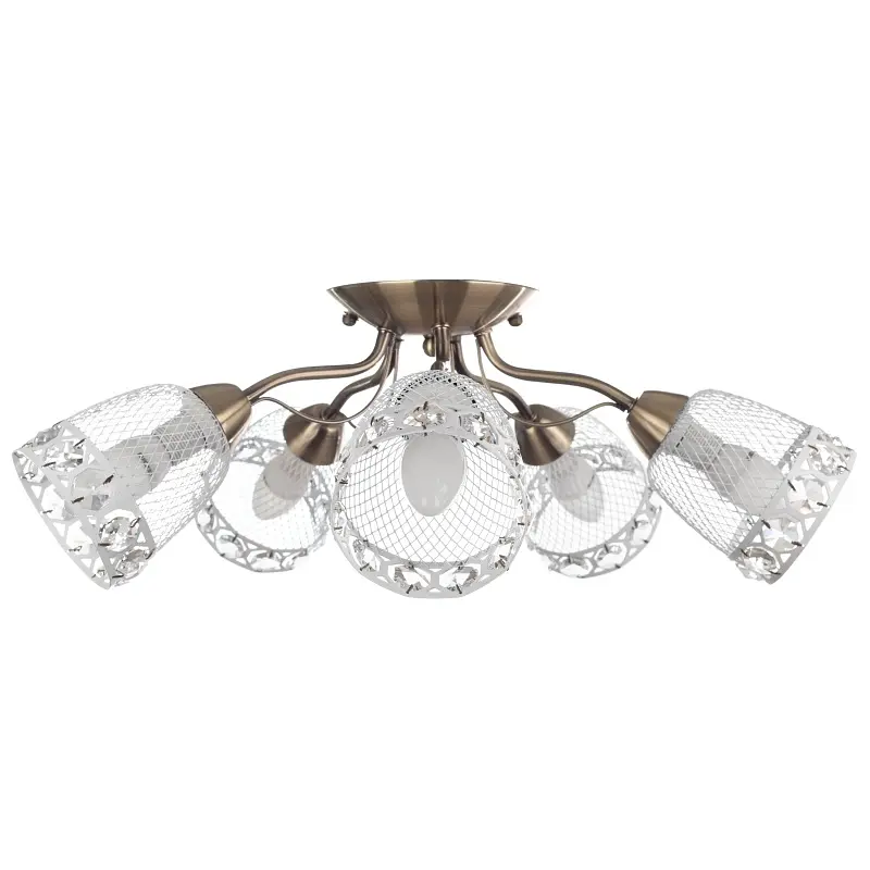 Если ваша спальня, гостиная или прихожая не могут похвастаться высоким потолком и большими габаритами, тогда люстра BKL-584S/5 E14 AB создана именно для вас. Изготовлена она из металла. Конструкция состоит из небольшого металлического каркаса цвета старое золото, к которому прикреплены пять плафонов. Плафоны стеклянные, прозрачные, декорированы стеклянными прозрачными гранеными камешками. Для работы необходимо использовать пять лампочек с цоколем Е14. Рассчитана люстра для работы в сети 220 В. С помощью данного светильника можно не только качественно осветить пространство, но и украсить его. На всю продукцию действует гарантия.