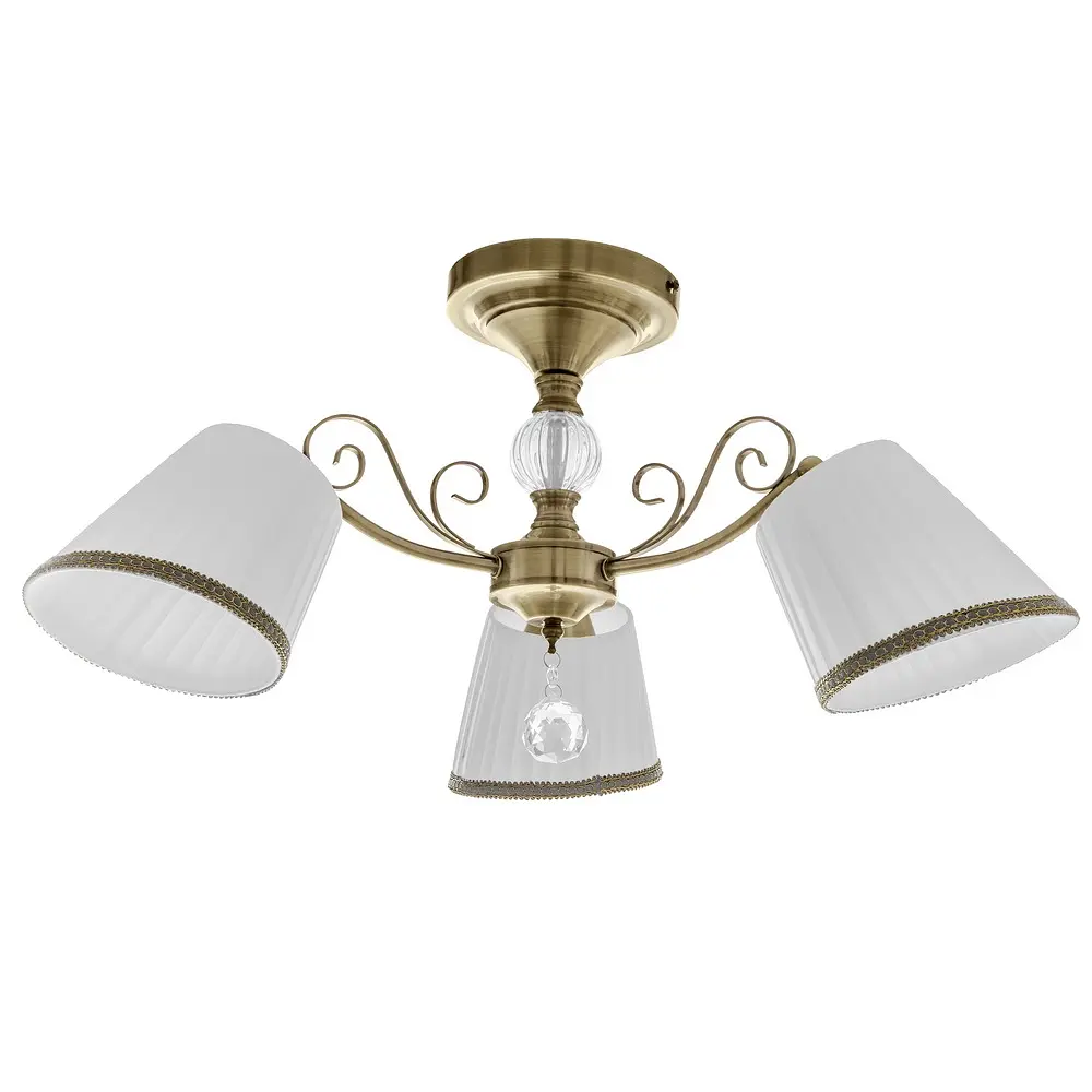 Люстра с абажурами BKL-716S/3 E14 AB обладает особой способностью привлекать к себе внимание. Все это благодаря плафонам-абажурам, которые создают приглушенное освещение, придавая свету мягкость, а помещению - романтическую атмосферу. Конструкция светильника представлена металлическим каркасом цвета старого золота, к которому прикреплены три плафона. Они изготовлены из ткани белого цвета. Каркас небольшой, с завитками, декорирован подвеской со стеклянным прозрачным граненым камешком. Для работы требуются три лампы с цоколем Е14 (раскалительная, энергосберегающая или светодиодная). Хорошо будет смотреться в гостиной или спальне.