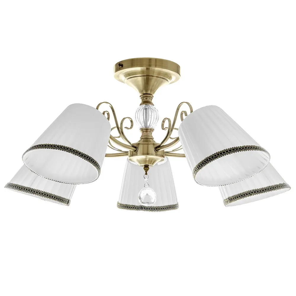 Люстра с абажурами BKL-716S/5 E14 AB обладает особой способностью привлекать к себе внимание. Все это благодаря плафонам-абажурам, которые создают приглушенное освещение, придавая свету мягкость, а помещению - романтическую атмосферу. Конструкция светильника представлена металлическим каркасом цвета старого золота, к которому прикреплены пять плафонов. Они изготовлены из ткани белого цвета. Каркас небольшой, с завитками, декорирован подвеской со стеклянным прозрачным граненым камешком. Для работы требуются пять лампочек с цоколем Е14 (разогревающая, энергосберегающая или светодиодная). Хорошо будет смотреться в гостиной или спальне.