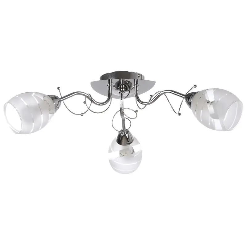Изготовлена люстра из металла и стекла, ее конструкция состоит из металлического фигурного хромированного каркаса, плотно прилегающего к потолку и трех стеклянных прозрачных плафонов продолговатой формы с нежными, почти незаметными полосками. Для работы люстры необходимо использовать три лампочки с цоколем Е14 мощностью 40 Вт. Такая люстра будет отлично сочетаться с легкими цветочными занавесками, светлыми мягкими креслами и большими окнами.