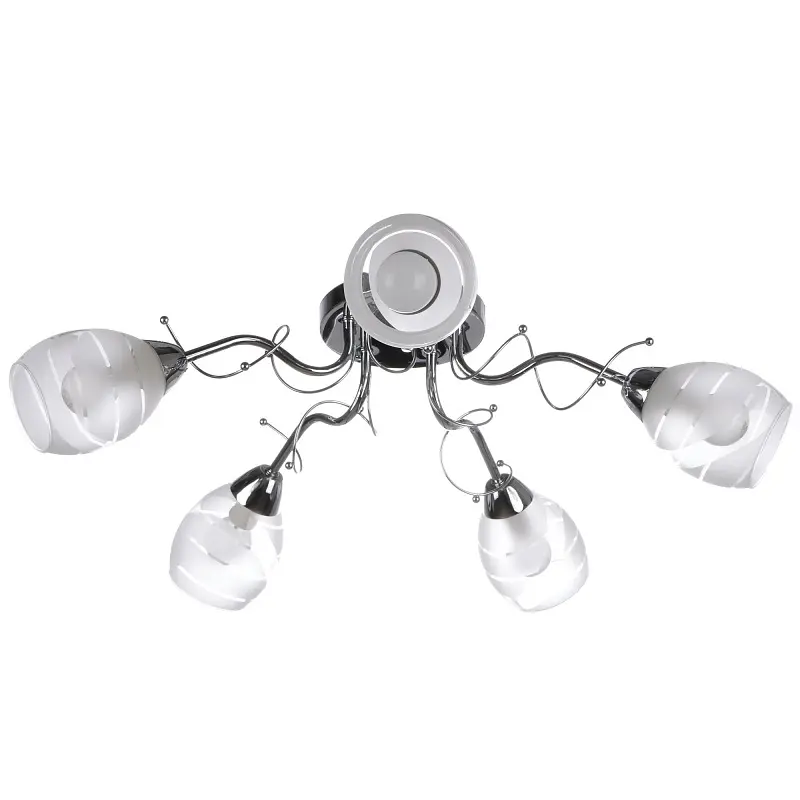 Изготовлена люстра из металла и стекла, ее конструкция состоит из металлического фигурного хромированного каркаса, плотно прилегающего к потолку и пяти стеклянных прозрачных плафонов продолговатой формы с нежными, почти незаметными полосками. Для работы люстры необходимо использовать пять лампочек с цоколем Е14 мощностью 40 Вт. Такая люстра будет отлично сочетаться с легкими цветочными занавесками, светлыми мягкими креслами и большими окнами.