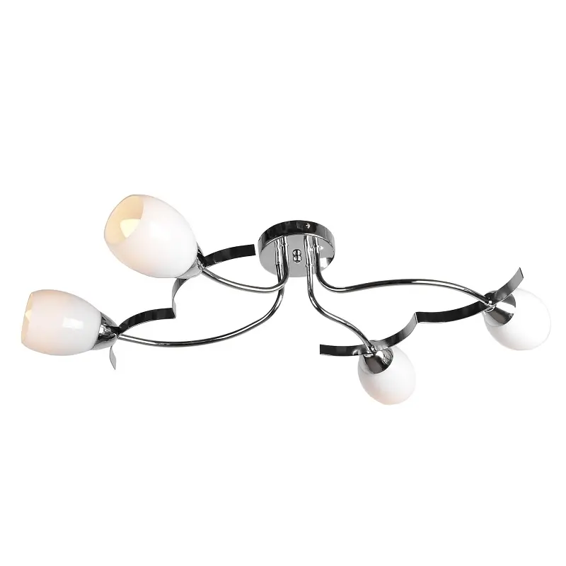 Плавные линии, светлые цвета, легкость и простота... Все это сочетает в себе Люстра LK-260C/4 E14. Ее художественное оформление лишено избытка декоративных элементов, все предельно ясно и просто. Такая люстра сможет украсить любую комнату в вашем доме, используют ее и как основной источник света в общественных помещениях. Изготовлена она из металла и стекла, достаточно проста в монтаже, не требует к себе особого ухода. К ее хромированному металлическому фигурному каркасу прикреплены четыре стеклянных матовых плафона белого цвета, которые направлены в стороны. Такое расположение плафонов позволяет осветить все уголки комнаты. Для ее работы необходимо 4 лампочки с цоколем Е14. Данная люстра решит проблему низких потолков и маленьких комнат, поскольку ее конструкция плотно прилегает к потолку и тем самым не утяжеляет внешний вид помещения.