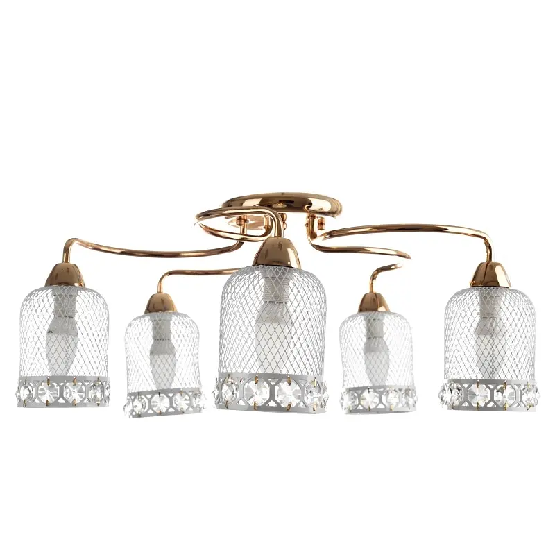 Главное преимущество этого осветительного прибора BKL-583S/5 E14 G очевидно: он компактный, легкий, подходит для установки в подвесной потолок, не займет жилое пространство помещения и не отяготит его внешний вид. Люстра изготовлена из металла. Конструкция представлена небольшим металлическим золотистым каркасом, к которому прикреплены пять плафонов. Плафоны тоже металлические, белого цвета, с множеством зазоров, через которые будет проходить свет. Плафоны дополнительно украшены стеклянными гранеными камешками. Светоотдача от люстры будет максимальной, для ее работы необходимо использовать пять лампочек с цоколем Е14.