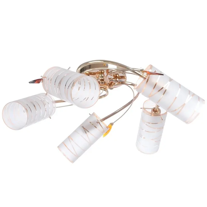 Простота, лаконичность, изящные формы, изогнутые линии - все это сочетает в себе люстра LK-172S/5. Люстра имеет пять стеклянных плафонов в форме цилиндра с матовым вкраплением белого цвета и золотистыми полосками. Плафоны прикреплены к металлическому каркасу золотистого цвета, который декорирован дополнительными декоративными элементами. Для работы люстры необходимо пять лампочек с цоколем Е14 мощностью 60 Вт. Люстра достаточно прочная и долговечная. Выполнена в классическом стиле, поэтому не потеряет свою актуальность и через пару лет. Люстра будет хорошо смотреться с белым потолком, светлыми стенами, мягкой мебелью и стеклянным столом. Внесет в комнату свежесть и легкость.