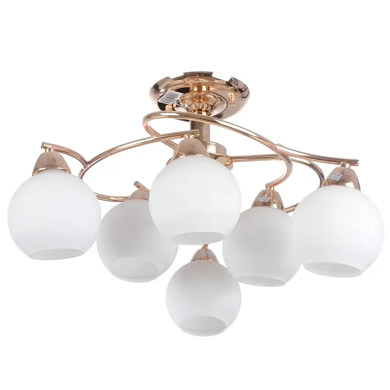 Люстры являются важнейшим предметом интерьера и главным источником света в любом помещении. Ведь если в помещении будет тусклое или слишком яркое освещение, то ваши глаза быстро устанут, а вы будете испытывать дискомфорт. Потолочная люстра способна подарить вам качественное освещение, а еще станет лучшим украшением вашего дома. Изготовлена люстра из металла и стекла, ее конструкция плотно прилегает к потолку, так что вы смело можете вешать ее в небольших помещениях с низкими потолками. Конструкцию люстры составляет металлический золотистый каркас и шесть стеклянных плафонов белого цвета. Люстра излучает мягкий, слегка приглушенный свет. Для достижения яркого освещения вы можете использовать бра или торшер, выполненные в том же стиле, что и люстра. Хорошо она будет смотреться и с настольной лампой. Для работы потолочной люстры необходимо шесть лампочек с цоколем Е14.