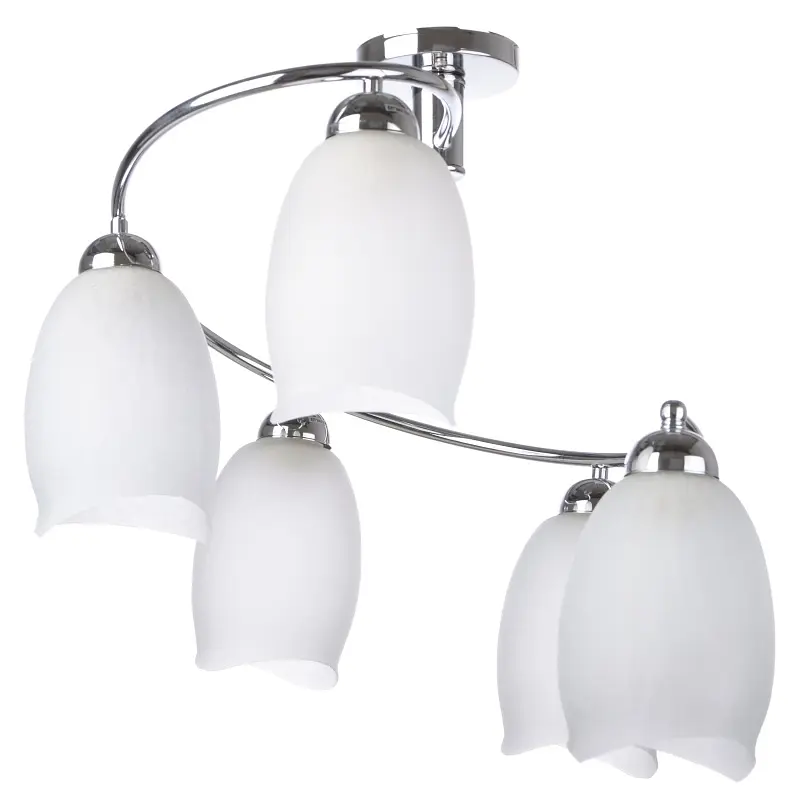 Мы покупаем мобильные телефоны, потому что боимся, что нас могут не найти в случае необходимости, мы приобретаем различную бытовую технику, потому что хотим сделать свою жизнь максимально комфортной, мы придумываем различный дизайн интерьера нашего дома, только для того, чтобы удивить гостей, соседей и себе приятное сделать... В конце концов, мы выбираем светильники в дом, чтобы с помощью освещения придать ему уют. Вот поэтому "потому что" и "потому что" позвольте представить вашему вниманию люстру для потолка в современном стиле LK-267C/5 E27. Поверьте, она сможет подарить вам приятные минуты отдыха в компании интересной книги или близких вам людей. Изготовлена люстра из металла и стекла, представляет собой металлический каркас полукруглой формы, к которому прикреплено пять небольших плафонов в форме чаши с неровными краями. Плафоны матовые, белые. Люстра покрыта хромом, во включенном состоянии вы сможете наблюдать необычайно красивую игру света. Для работы люстры необходимо пять лампочек с цоколем Е27 мощностью 60 Вт. Повесить такую люстру вы сможете в любой комнате дома, где, по вашему мнению, она будет смотреться наиболее выигрышно.