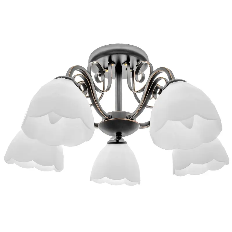 Люстра LK-577S/5 E27 BK будет прекрасно смотреться в спальне, гостиной или прихожей. Металлический каркас темно-коричневого цвета отличается прочностью. Покрытие корпуса дополнено золотистыми штрихами, что придает изделию изысканность и винтажность. Держатели патронов изогнуты так, что они вместе с плафонами напоминают цветок подснежника. Корпус декорирован металлическими завитками. Белые матовые плафоны изготовлены из стекла. Особую легкость модели обеспечивают их фигурные края. Люстра подойдет для освещения классического интерьера, также ее можно использовать в помещениях, оформленных в флористическом и скандинавском стилях. Если планируете применять локальное освещение в комнате, можно выбрать бра из этой же серии. Для работы люстры необходимо 5 ламп с цоколем E27. Подходят светодиодные, энергосберегающие или лампы накаливания. На потолок люстра устанавливается с помощью монтажной планки. На всю продукцию действует гарантия.