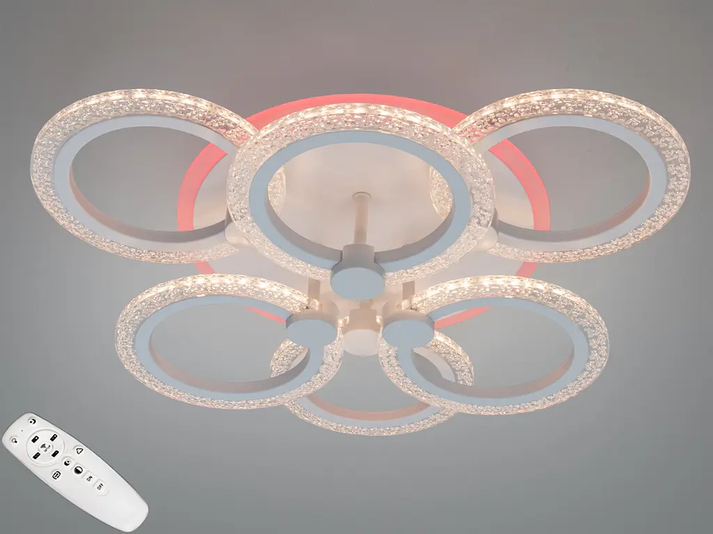 Потолочная светодиодная люстра Diasha в белом цвете сочетает шесть световых колец, пульт дистанционного управления, диммирование и трехцветную подсветку основания. Мощность 74 W обычно достаточна для равномерного освещения помещений до 13 м², где важно быстро менять атмосферу от теплого до холодного белого света.