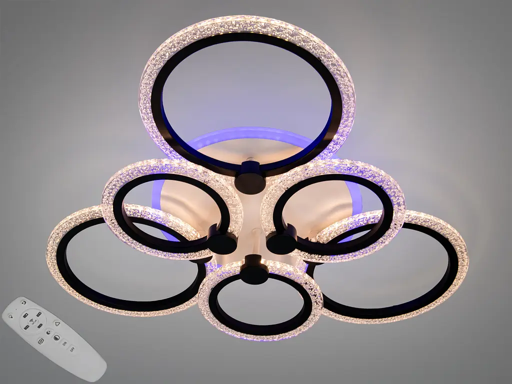 Потолочная светодиодная люстра Diasha в белом цвете сочетает шесть световых колец, пульт дистанционного управления, диммирование и трехцветную подсветку основания. Мощность 74 W обычно достаточна для равномерного освещения помещений до 13 м², где важно быстро менять атмосферу от теплого до холодного белого света.