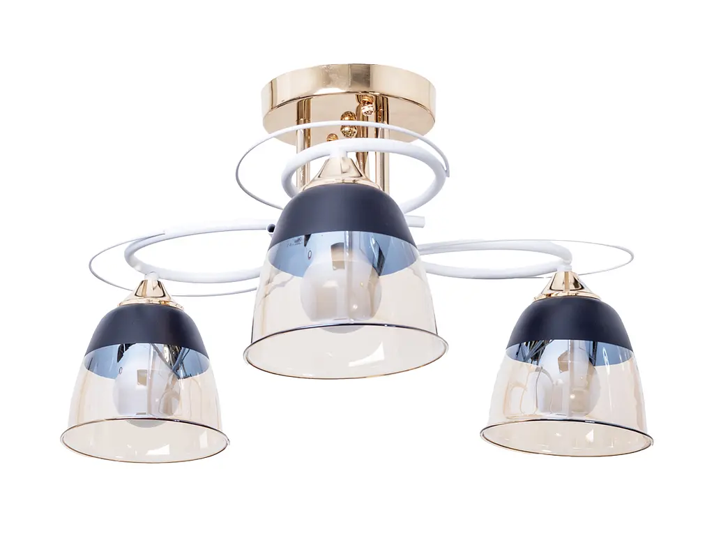 Люстра потолочная LK-727S/3 E27 WH+FG - это воплощение современного дизайна и высокого качества. Изготовлена из прочных материалов и прослужит вам долгие годы. Люстра имеет металлический корпус в бело-золотом цвете. На трех фигурных держателях расположены прозрачные стеклянные плафоны со стильной золотисто-черной гаммой, которая придает ей особый характер. В качестве источников света используются три лампы с цоколем Е27 и максимальной мощностью 60 Вт. Она предоставляет возможность использования различных источников света, таких как светодиодные лампы, энергосберегающие лампочки или накаливания, что делает ее универсальным выбором. Эта люстра легко монтируется и интегрируется в интерьер, обеспечивая равномерное и приятное освещение. Идеально подходит для использования в жилых помещениях, офисах, магазинах и других коммерческих пространствах. Подойдет для освещения квартиры, кафе, хостела или шоу-рума. Она впишется как в классический, так и в современный интерьер.