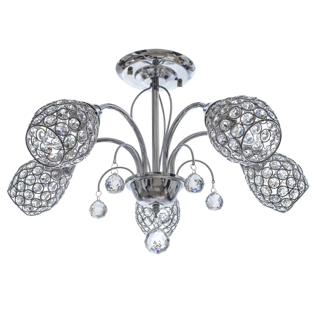 Такая люстра украсит смелые и оригинальные интерьеры. Благодаря множеству стеклянных элементов освещение в комнате будет максимальным и ярким, что создаст хорошее настроение. Осветительный прибор изготовлен из металла цвета хром и декорирован стеклянными подвесками. Плафон выполнен из металла цвета хром со стеклянными вставками. Крепится изделие с помощью монтажной планки. Для работы осветительного прибора требуется 5 лампочек с цоколем E14. Подойдут лампы любого типа (раскаленные, светодиодные, энергосберегающие). Люстра будет хорошо смотреться в гостиной, прихожей, кухне или спальне.