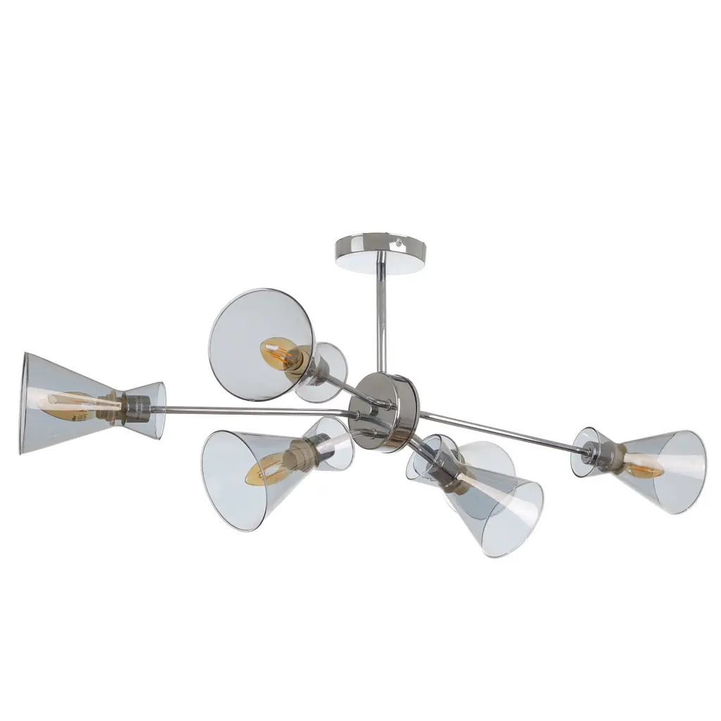 Люстра лофт LK-670S/6 E14 CH - это стильный светильник цвета хром, который будет хорошо смотреться в гостиной, спальне или холле, интерьер которых выполнен в современном ключе. Она станет идеальным вариантом для интерьеров в стиле хай-тек или техно. Люстра LK-670S/6 E14 CH имеет шесть плафонов и подойдет для освещения помещений различной площади. Ее металлический каркас состоит из основания, стержня и нижней базы, к которой крепятся ножки с плафонами. Модель устанавливают с помощью монтажной планки. Настоящим украшением осветительного прибора служат оригинальные стеклянные плафоны. Они небольшие, но хорошо пропускают свет и равномерно распределяют световой поток. Хром и стекло позволяют светильнику идеально вписаться в современные интерьеры. Компактные размеры люстры позволяют монтировать ее в помещениях со стандартной высотой потолков. Ширина модели (880 мм) обеспечивает освещение достаточно большой площади. Для работы светильника требуются шесть лампочек с цоколем E14 и максимальной мощностью 40 Вт каждая. Вариант подобной модели на четыре плафона можно найти под артикулом 23-808.