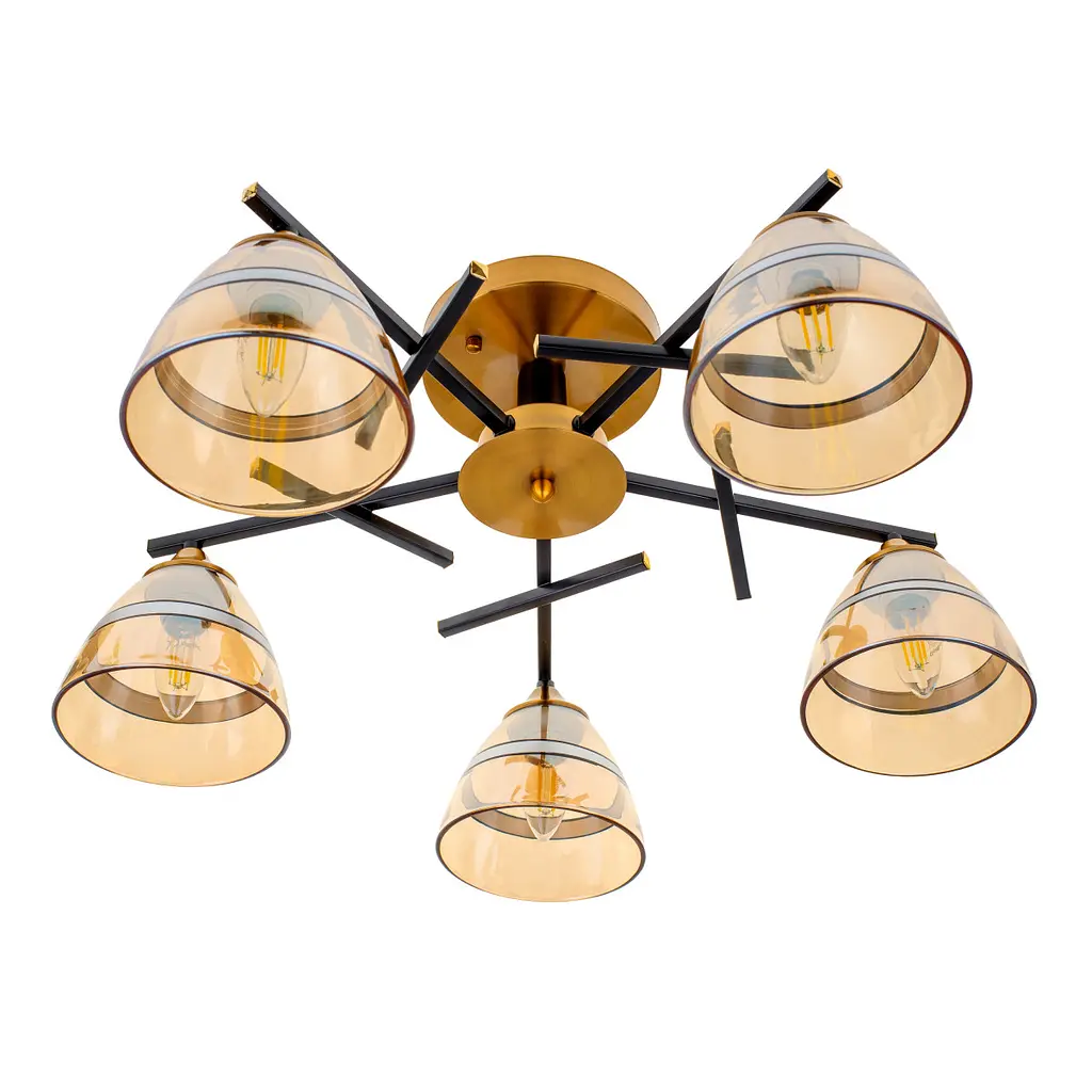 Люстра LK-714S/5 E27 BK+GDB выполнена в черно-золотистом цвете. Ее корпус сделан из металла, а пять плафонов - из тонкого прозрачного стекла, украшенного декоративной каймой. Источники света в этой модели - лампы с цоколем Е27 и максимальной мощностью 60 Вт. Это могут быть светодиодные, энергосберегающие или лампочки накаливания. Световой поток люстры направлен вниз, высота конструкции - небольшая. Такое решение делает ее пригодной для помещений с низкими потолками. Дизайн светильника впишется в интерьер жилой квартиры, кафе, магазина или гостиницы.