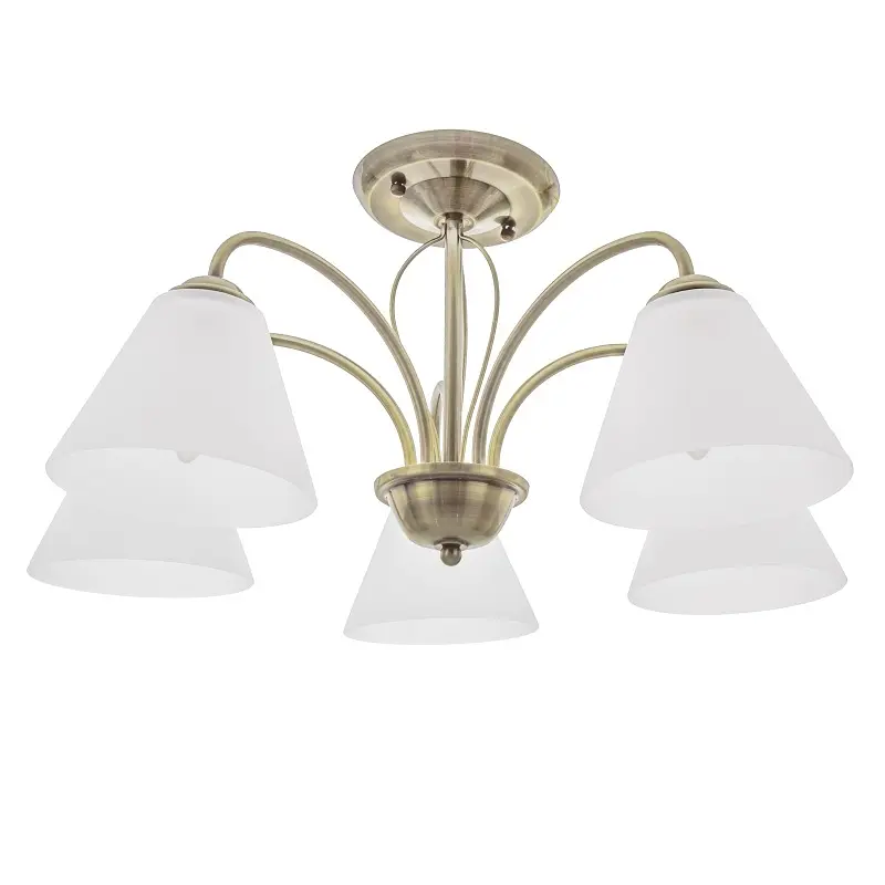 Люстра LK-566S/5 E27 AB отлично впишется в классический интерьер. Металлический каркас выполнен в цвет старого золота. Матовые белые плафоны в форме срезанного конуса сделаны из стекла. Для работы люстры нужно использовать 5 лампочек с цоколем E27 мощностью 60 Вт. Подойдут светодиодные, энергосберегающие и лампочки накаливания. Люстра подойдет для освещения спальни или гостиной. Она понравится всем, кто ценит лаконичность и простейшие формы. Люстра будет излучать мягкий приятный свет и наполнит дом уютом. На всю продукцию действует гарантия.