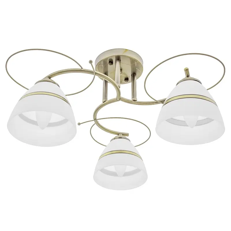 Люстра потолочная LK-586S/3 E27 AB прекрасно подходит для интерьеров в классическом стиле. Металлический каркас выполнен в цвет старого золота. Полосками такого же цвета украшены белые стеклянные плафоны в форме чаши. Такая люстра будет хорошо смотреться в гостиной, спальне или столовой. Для работы люстры требуется 3 лампочки с цоколем E27 мощностью 60 Вт. Можно использовать светодиодные, энергосберегающие или лампочки накаливания. Рекомендуем использовать светодиодные лампы, поскольку они не нагреваются, экономят электроэнергию и не содержат вредных веществ. На всю продукцию действует гарантия.