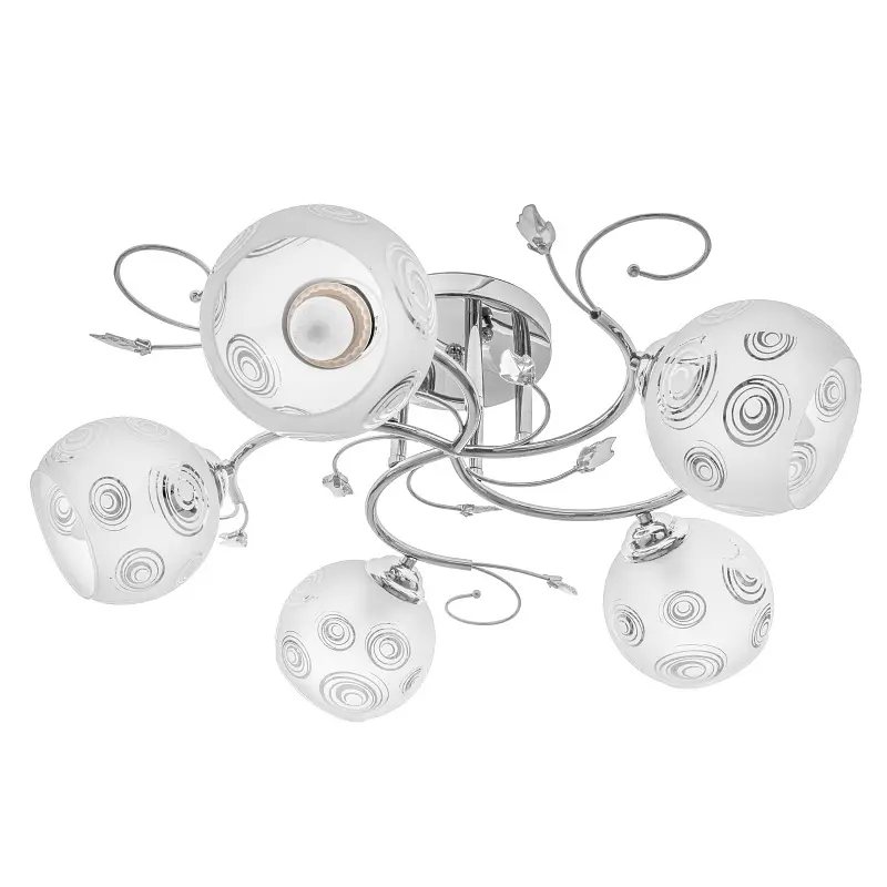 Простая люстра в классическом стиле LK-584S/5 E27 CH подойдет для освещения гостиной, спальни или прихожей. Металлический хромированный каркас дополнен декоративными элементами. Белые стеклянные плафоны в форме чаши украшены узором, напоминающим спираль. Небольшой размер люстры позволяет поместить ее в комнате с низким потолком. Для работы светильника требуется 5 лампочек с цоколем E27 мощностью 60 Вт. Подойдут светодиодные, энергосберегающие или лампочки накаливания. Рекомендуем использовать светодиодные лампы, поскольку они не нагреваются, экономят электроэнергию и не содержат вредных веществ. На всю продукцию действует гарантия.