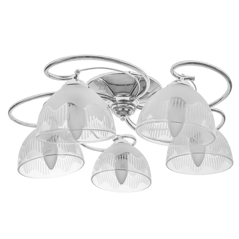 Люстра LK-593S/5 E27 CH отлично подходит для освещения гостиной, спальни или прихожей. Она состоит из металлического хромированного каркаса и стеклянных плафонов в форме чаши. Часть плафона - прозрачная, часть выполнена в белом цвете. Для работы люстры требуется 5 лампочек с цоколем E27 мощностью 60 Вт. Подходят светодиодные, энергосберегающие или лампочки накаливания. Рекомендуем использовать светодиодные лампы, поскольку они не нагреваются, экономят электроэнергию и не содержат вредных веществ.