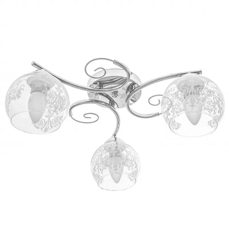 Люстра потолочная LK-596S/3 E27 CH в стиле модерн украсит вашу спальню или гостиную. Она состоит из металлического хромированного каркаса и стеклянных прозрачных плафонов. Плафоны декорированы изящным узором белого цвета. Люстра не будет слишком выделяться в интерьере, но придаст ему изысканности. Для работы люстры требуется 3 лампочки с цоколем E27 мощностью 60 Вт. Подходят светодиодные, энергосберегающие или лампочки накаливания. Рекомендуем использовать светодиодные лампы, поскольку они не нагреваются, экономят электроэнергию и не содержат вредных веществ. На всю продукцию действует гарантия.