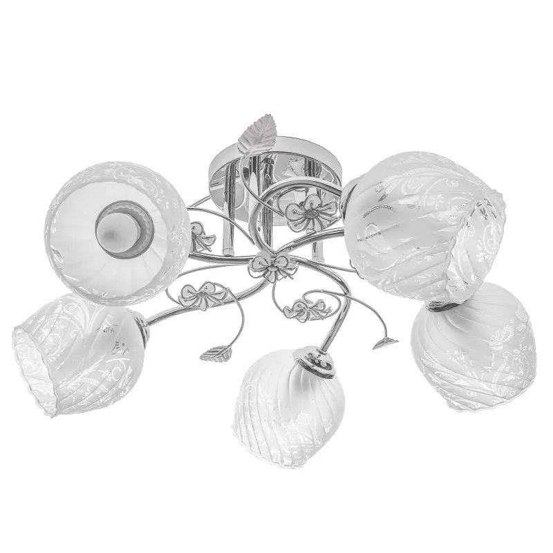 Люстра потолочная LK-597S/5 E27 CH будет прекрасно смотреться в классическом интерьере гостиной или спальни. Металлический хромированный каркас дополнен декоративными элементами в виде цветов и листочков. Белые матовые плафоны с рельефной поверхностью изготовлены из стекла. Они украшены ненавязчивым растительным узором. Для работы люстры требуется 5 лампочек с цоколем E27 мощностью 60 Вт. Подходят светодиодные, энергосберегающие или лампочки накаливания. Рекомендуем использовать светодиодные лампы, поскольку они не нагреваются, экономят электроэнергию и не содержат вредных веществ.