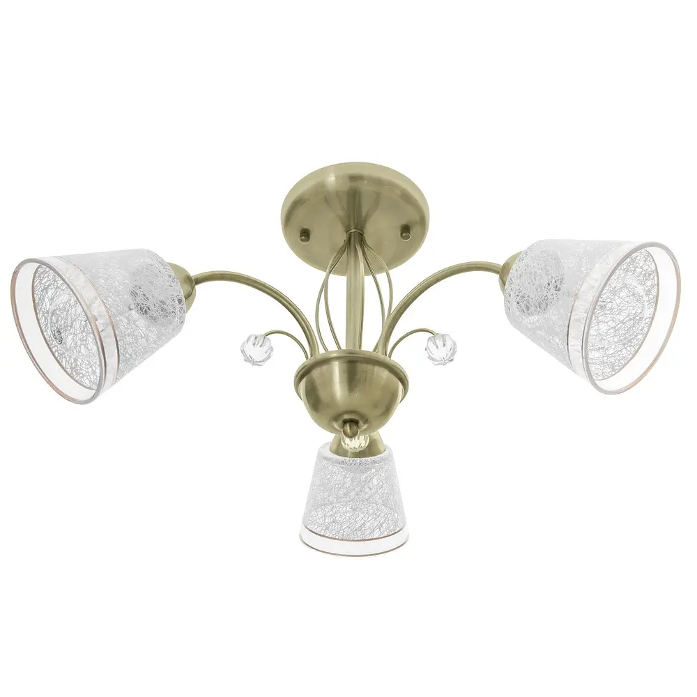 Чем меньше помещение, тем проще должно быть освещение. Люстра LK-637S/3 E27 AB предназначена для небольших помещений с невысокими потолками, выполненными в классическом стиле. Изготовлена она из металла и стекла, компактна, не займет жилое пространство помещения. К металлическому каркасу цвета бронзы прикреплены три плафона. Плафоны стеклянные, выполнены в форме перевернутой чаши, декорированы едва заметным узором. Дополнительно люстра украшена прозрачными гранеными камешками из стекла. Для работы нужно использовать три лампы с цоколем Е27 (разожженная, энергосберегающая, светодиодная).