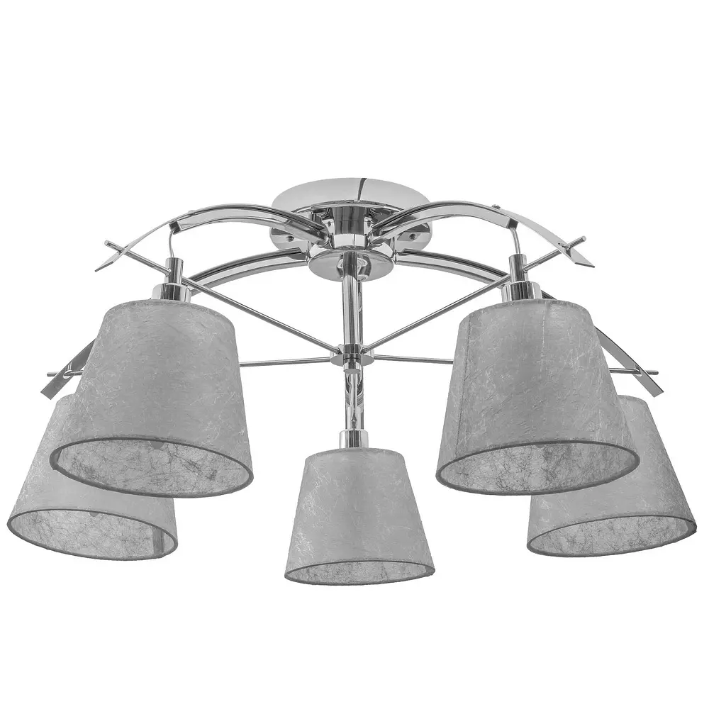 Люстра потолочная с абажурами BKL-599S/5 E14 CH используется в интерьерах, оформленных в стиле классика или модерн. Такой осветительный прибор будет уместен практически в любом помещении: гостиной, спальне, прихожей. Он создаст направленный приглушенный свет, от которого не устают глаза. Мягкое освещение будет способствовать расслаблению после тяжелого рабочего дня. Люстра изготовлена из металла и ткани. Конструкция представлена небольшим металлическим каркасом цвета хром, к которому прикреплены пять абажуров. Плафоны тканевые, серого цвета. Для работы необходимо использовать пять лампочек с цоколем Е14 (раскалительная, энергосберегающая, светодиодная). Люстра с абажуром способна создать ощущение свободы в помещении. Удачной находкой это будет для комнат с низкими потолками. Абажур позволит визуально расширить пространство.