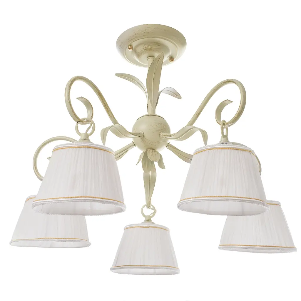 Люстра с абажурами украсит и осветит помещение, выполненные в стиле кантри, прованс, классика. Металлический каркас белого цвета с вкраплениями золотистого и пять текстильных плафонов хорошо сочетаются между собой, что позволило мастерам изготовить одновременно красивый и прочный светильник. Для работы необходимо использовать пять лампочек с цоколем Е14 (раскалительная, энергосберегающая, светодиодная). Включать и выключать люстру необходимо с помощью настенного клавишного выключателя. Предназначена для работы от сети 220 В в гостиной, спальне, прихожей.
