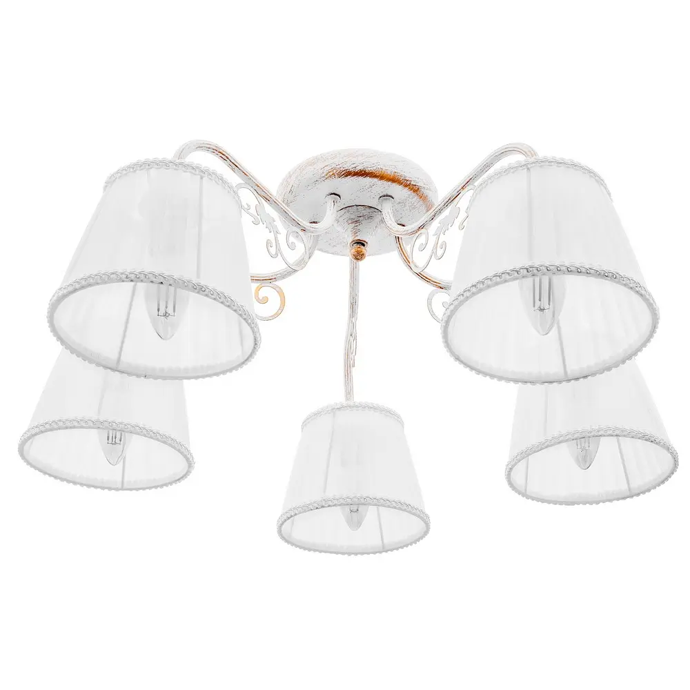 Люстра с абажурами BKL-660S/5 E14 WH/G - эффективный инструмент для приглушения освещения с целью создания максимально уютной атмосферы в доме. Наиболее подходящим местом для ее монтажа является спальня. Конструкция представлена в виде металлического каркаса белого цвета с вкраплениями золотистого, к которому прикреплены пять плафонов. Плафоны тканевые, белого цвета, декорированы тканевыми бантами. Дополнительно каркас украшен подвесками со стеклянными прозрачными гранеными камешками. Для работы необходимо использовать пять лампочек с цоколем Е14 (раскалительная, энергосберегающая, светодиодная). Высоту можно регулировать. На всю продукцию действует гарантия.