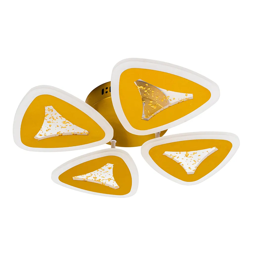 Диаметр 460 мм и высота 80 мм делают ее идеальным выбором для кухни, спальни, гостиной или кабинета. Золотистый каркас из металла придает изысканность и стиль, а четыре плафона в форме треугольников золотого цвета рассеивают свет равномерно, создавая неповторимый световой пейзаж.