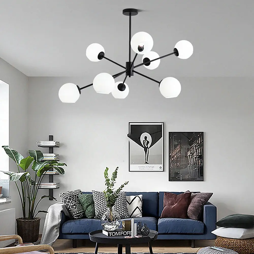 Люстра в металлическом черном корпусе с 6 белыми глянцевыми плафонами. Особенностью дизайна этой модели есть белые глянцевые плафоны (Ø 15 см) с вырезом, который можно направлять в любую сторону. Это создает в помещении особую световую атмосферу, где свет и тени играют в гармонии. Высота люстры регулируется (28 или 60 см) в зависимости от особенностей интерьера. Модель представлена в двух цветах корпуса (черный и латунь) и двух комплектациях: - на 6 плафонов - диаметр 80 см, длина рожков 16 см. - На 8 плафонов - диаметр 90 см, длина рожков 21 см. Благодаря простоте и элегантности эти подвесные светильники идеально дополняют интерьер любого помещения, создавая уникальную современную атмосферу комфорта и стиля. Мощность (Вт): 90 Серия: F 68 Цвет основы: Черный Цвет плафона: Белый Размер потолочной основы: 15х2,5 см Максимальная высота: 60 см Минимальная высота: 28 см Тип цоколя: E14 Размер плафона: 15 см Материал основы: Металллл Размер монтажной планки: 13 см Тип крепления: Монтажная планка Количество источников света: 8