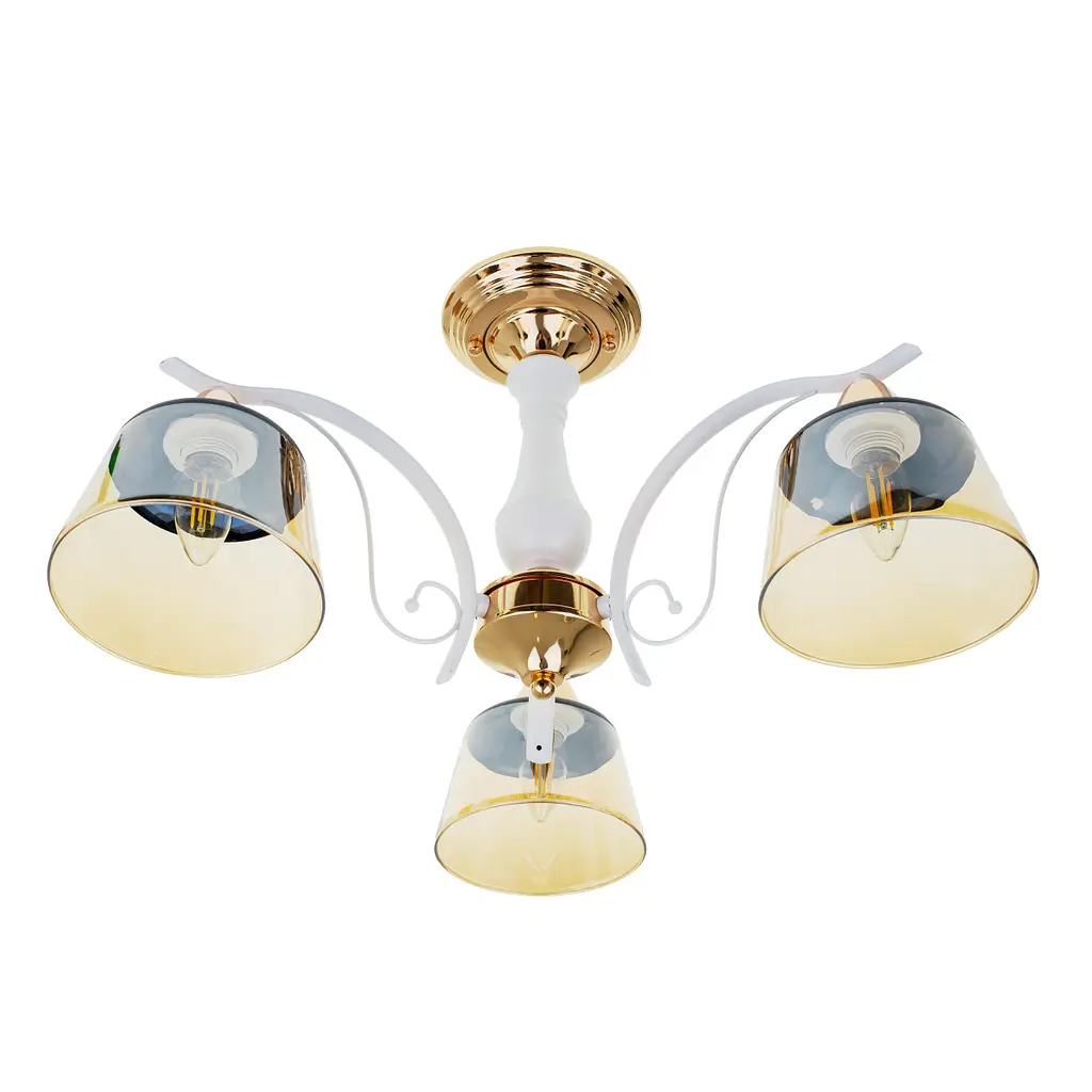 Люстра LK-699S_3 E27 WH+FG имеет металлический корпус в бело-золотом цвете. На трех фигурных держателях расположены золотистые прозрачные плафоны из стекла. Они направлены вниз, что обеспечивает равномерное направленное освещение помещения. В качестве источников света используются три лампы с цоколем Е27 и максимальной мощностью 60 Вт. Это могут быть светодиодные, энергосберегающие или лампочки накаливания. Такая люстра подойдет для освещения квартиры, кафе, хостела или шоу-рума. Она впишется как в классический, так и в современный интерьер.