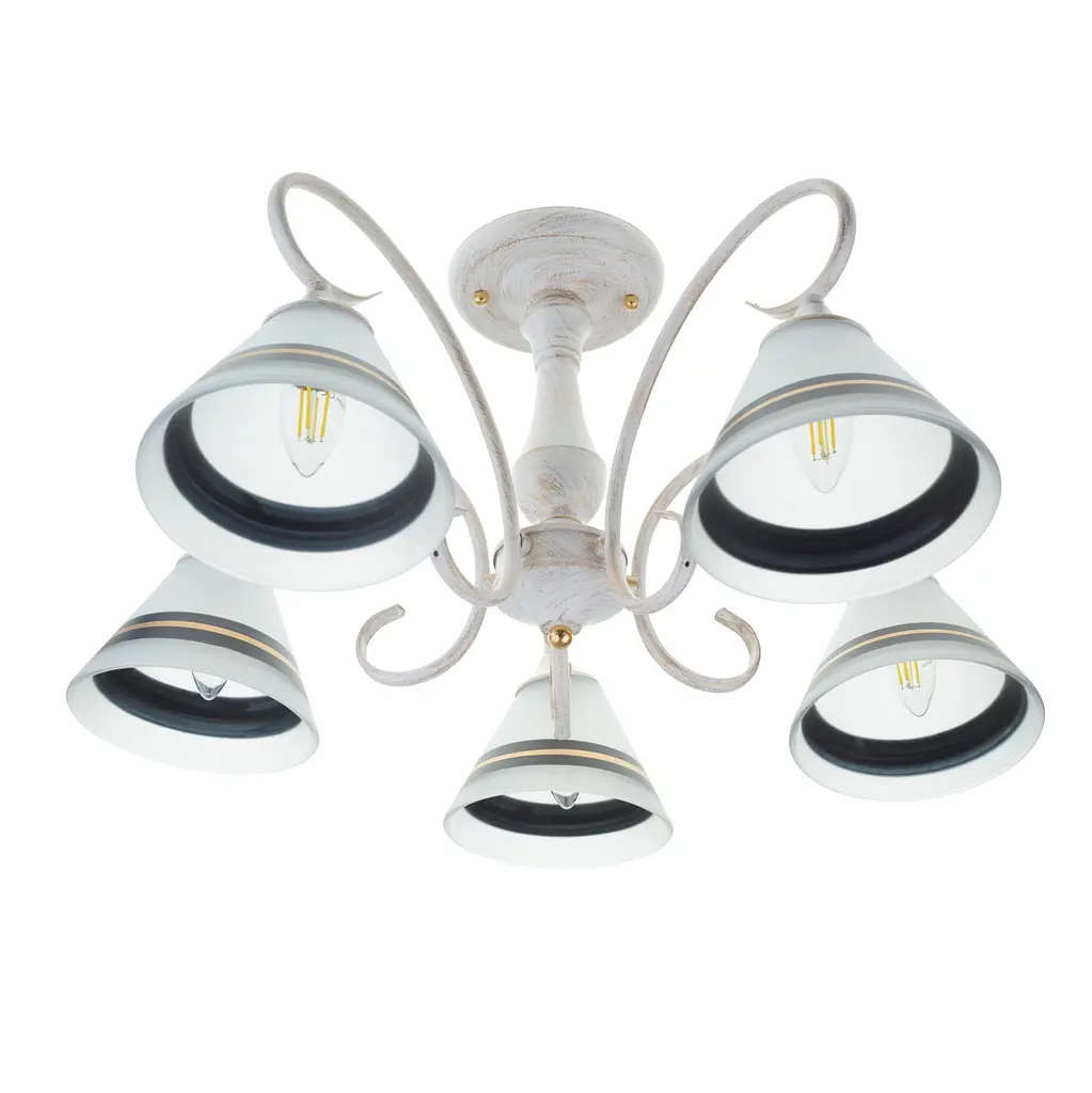 Люстра LK-707S/5 E27 WHG имеет металлический корпус белого цвета. Пять плафонов изготовлены из матового полупрозрачного стекла, украшенного черной каймой с золотистой линией посередине. В качестве источников света используются пять лампочек с цоколем Е27 и максимальной мощностью 60 Вт. Это могут быть светодиодные, энергосберегающие или лампы накаливания. Дизайн светильника, с фигурной основой и изящными держателями подходит скорее к классическим интерьерам, но сможет вписаться и в их современные интерпретации. Люстра прекрасно будет смотреться в домашней обстановке, в кафе, гостинице или шоу-руме.