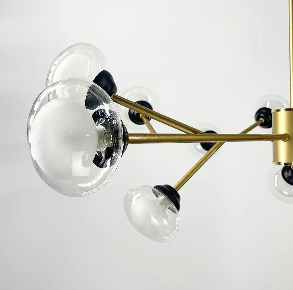 Люстра в стиле Contemporary в золотистом цвете корпуса с двойным плафоном Люстра представлена в нескольких размерах: на 6,9,12 или 15 плафонов Современный и стильный выбор для вашего дома! Количество источников света: 100 Серия: 9101 Цвет основы: Золотой Цвет плафона: Прозрачный, Матовый Максимальная высота: 80 см Минимальная высота: 33 см Тип цоколя: G9 Размер плафона: 12 см Материал основы: Металллл Размер монтажной планки: 12 см Тип крепления: Монтажная планка