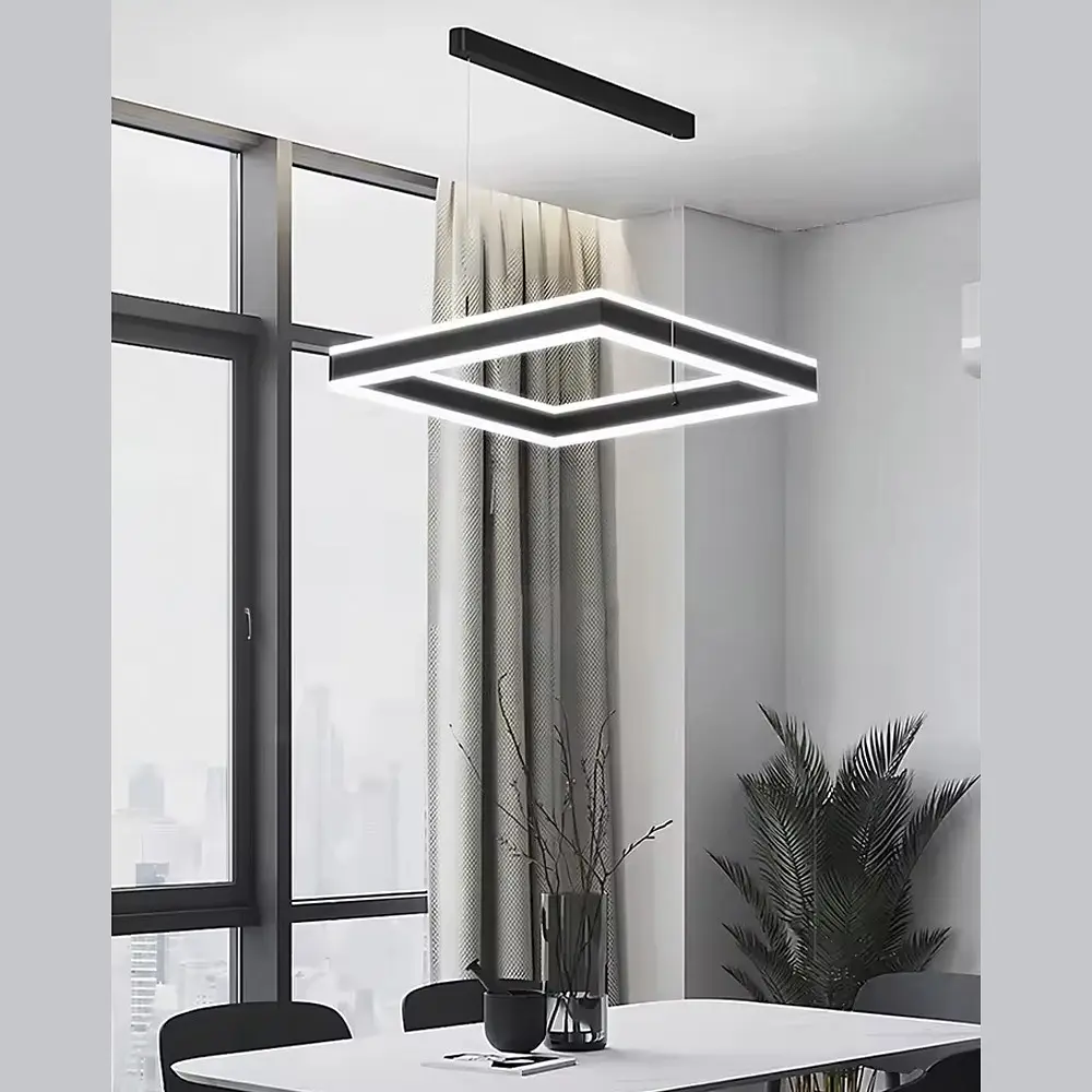 Серия LED-люстр с металлическими подвесными квадратами представлена в нескольких вариантах: Один квадрат размером 60х60х5 см - Арт: 303S-600 BK Два квадрата меньше: 60х60х5 см и 40х40х5 см - Арт: 303S-600+400 BK Два квадрата большего размера: 80х80х5 см и 60х60х5 см - Арт: 303S-800+600 BK Эти модели прекрасно дополняют друг друга и могут использоваться как отдельно, так и в сочетании для создания гармоничного освещения. Каждый квадрат оснащен встроенными светодиодами, скрытыми за акриловым рассеивателем вверху и внизу, что обеспечивает равномерный и приятный свет. Доступны три режима освещения - теплое, нейтральное и холодное. Основное преимущество серии - возможность регулировки общей высоты люстры, а также настройки расстояния между квадратами и их положения, что позволяет адаптировать освещение под любое пространство и настроение. Эти современные люстры отлично подходят для минималистичных и хай-тек интерьеров, где важна строгость форм и функциональность. Они станут стильным дополнением к гостиной, спальне или рабочему кабинету, придавая помещению современный вид и обеспечивая комфортное освещение для любых нужд. Тип цоколя: 60 Форма изделия: Квадрат Серия: 303S Цвет основания: Черный Размер потолочного основания: 62х3,5 см Цветовая температура: 3000–4500–6000К Максимальная высота: 115 см Минимальная высота: 20 см Материал основания: Металл Размер монтажной планки: 31 см Тип крепления: Монтажная планка Мощность (Вт): 106