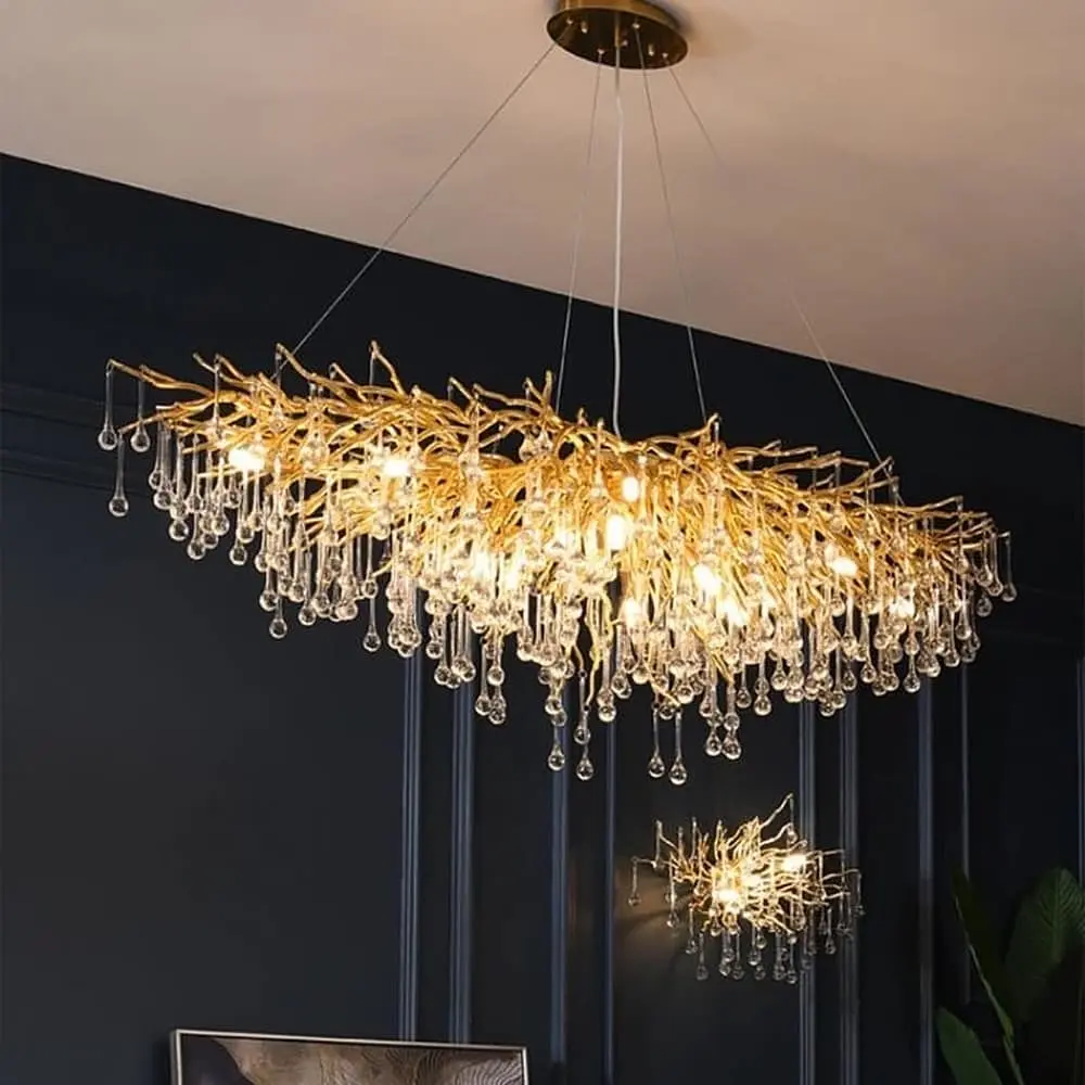 Серия подвесных люстр в роскошном золотом исполнении - это гармония элегантности, теплого сияния и мягкого хрустального блеска. Дизайн вдохновлен естественной динамикой веток, с которых спадают прозрачные стеклянные подвески, напоминающие капли росы. В сочетании с золотым корпусом они создают изысканную игру света и теней в пространстве. Золотой металлический каркас придает люстре выразительность, усиливает глубину и добавляет интерьеру изысканный характер. Благодаря цоколю G9 и регулируемой высоте, люстра легко подстраивается под помещения с разной высотой потолка. Серия представлена в двух формах: Круглый корпус: • Ø40 см - 6 ламп • Ø60 см - 8 ламп • Ø80 см - 10 ламп • Ø100 см - 13 ламп Удлиненный корпус: • 100×50 см - 10 ламп • 120×60 см - 13 ламп • 160×70 см - 13 ламп Коллекцию дополняет настенный бра Ø37 см в том же стиле - идеальное решение для зонального освещения. Эти люстры - не просто источник света, а настоящий акцентный элемент, преобразующий интерьер, придавая ему роскошную мягкость и тепло. Количество источников света: 120 Тип помещения: Люстры для гостиной (в зал) Форма_изделия: Овал Серия: 705 GD Цвет основы: Золотой Размер потолочной основы: 18х3 см Максимальная высота: 180 см Минимальная высота: 55 см Тип цоколя: G9 Материал основы: Металл Цвет хрусталя: Прозрачный Размер монтажной планки: 14 см Тип крепления: Монтажная планка