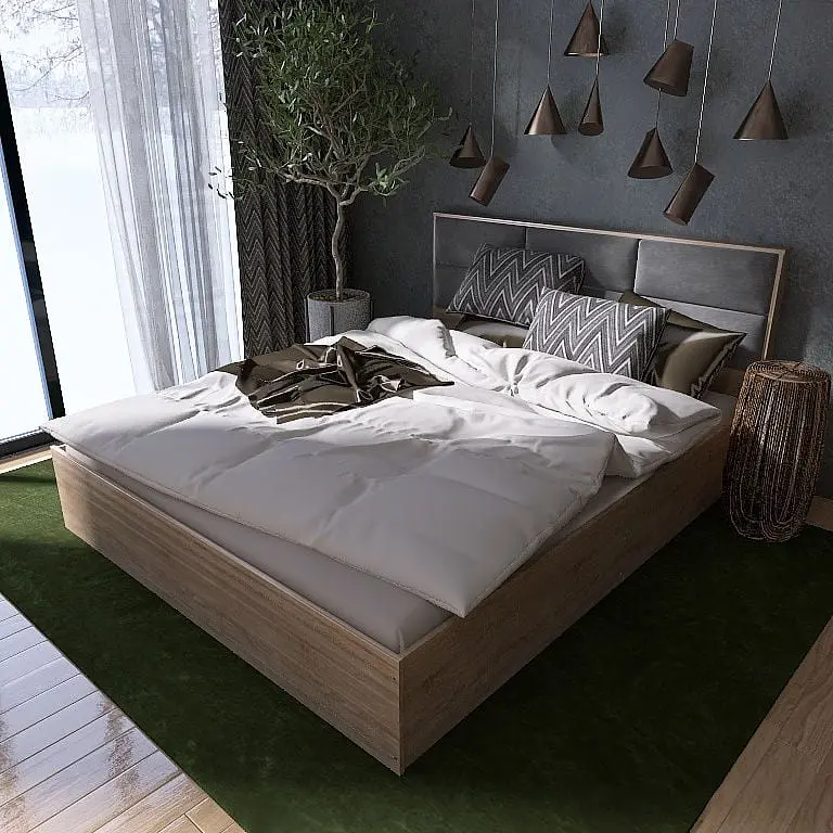 Основной особенностью этой модели является подъемный механизм с ламельным каркасом. Он позволяет легко поднять верхнюю часть кровати, создавая доступное пространство для хранения различных вещей под ней. Это особенно удобно в случае ограниченного пространства, потому что вы можете использовать внутренний объем кровати для хранения постельного белья, одежды и других предметов. В комплект также входит дно, выполненное из ДВП.