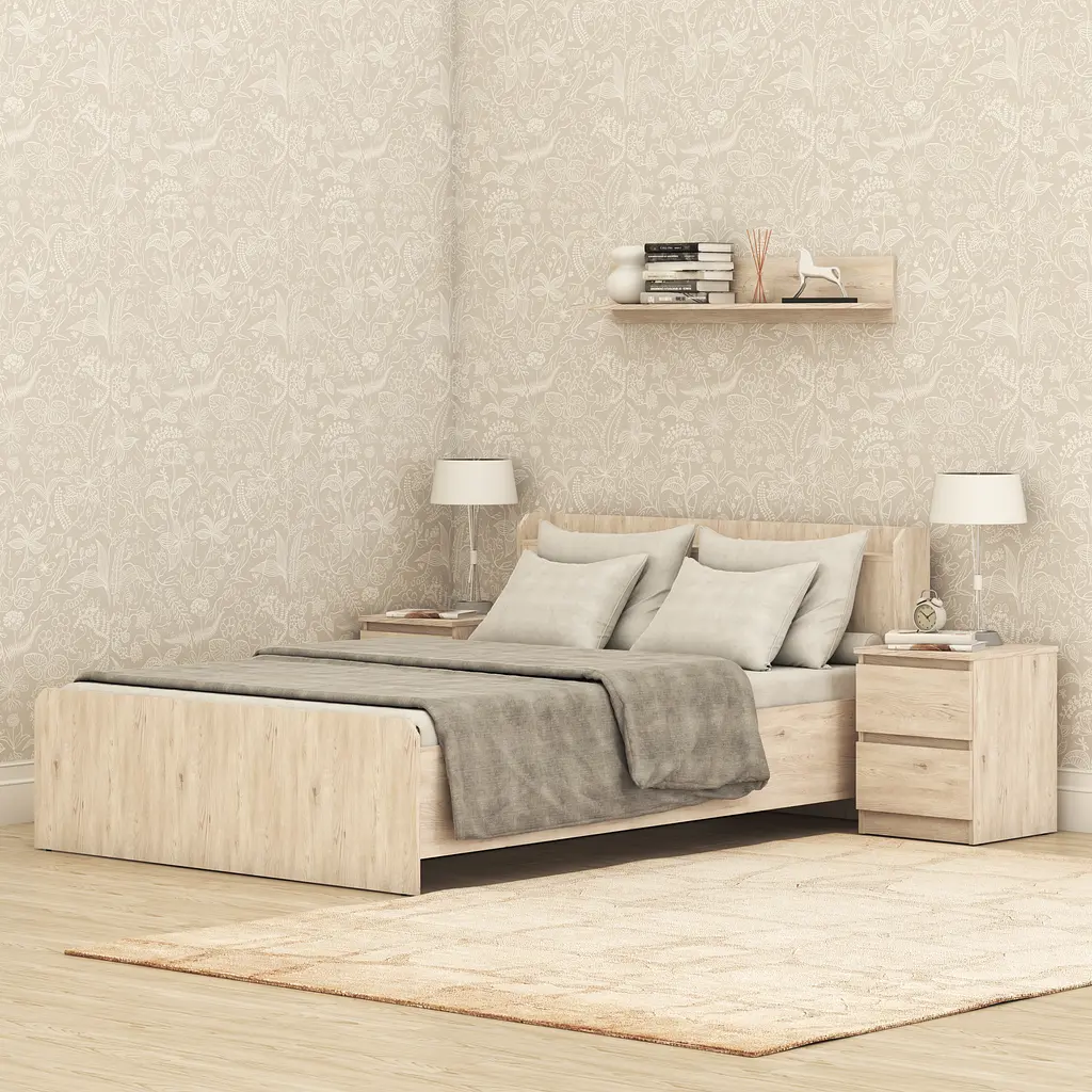 Двуспальная кровать MebelStar "Нео" - удобное пространство для двоих Двуспальная кровать MebelStar "Нео" – это современное решение для обустройства комфортного места для отдыха. Его минималистичный дизайн гармонично впишется в интерьер любой спальни, создавая уют и практичность. Особенности конструкции: Основа кровати состоит из прочных деревянных перекладин, которые обеспечивают надежную поддержку матраса; Компактная конструкция без ножек придает устойчивость и современный вид; Благодаря оптимальным размерам идеально подходит для двух человек; Кровать без выдвижных ящиков, что позволяет расположить ее даже в небольших комнатах. Размеры: Размер спального места (см): 140x200 Ширина (см): 148,2 Длина (см): 218,4 Высота спинки (см): 86 Эта кровать 140 на 200 см предлагает достаточно места для комфортного сна, а ее универсальная конструкция позволяет использовать кровать с различными видами матрасов. Обратите внимание! Оттенок изделия на фотографии может отличаться от реального из-за особенностей передачи цветов монитором, настроек фотооборудования и других технических факторов.